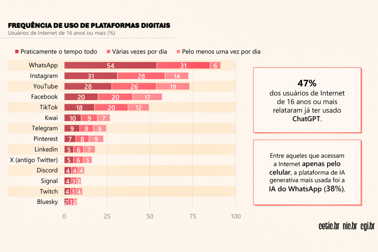 No Brasil, segundo o levantamento, são cinco as plataformas que dominam o gosto dos brasileiros no uso diário, qualquer que seja a finalidade: WhatsApp (que detém a dianteira com destaque), Instagram, YouTube, Facebook e TikTok.