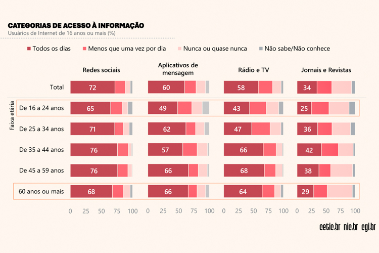 Outros dados mostram que 60% dos usuários que acessam notícias várias vezes por dia ou pelo menos uma vez por dia o fazem via aplicativos de mensagens, e via feeds de vídeos curtos, esse número é de 52% – esses índices superam o percentual de usuários que dizem acessar com frequência notícias por telejornais, de 45%. Ou seja, a grande maioria dos brasileiros se informa via redes sociais e aplicativos de mensagens, sem checar fonte ou veracidade das informações.