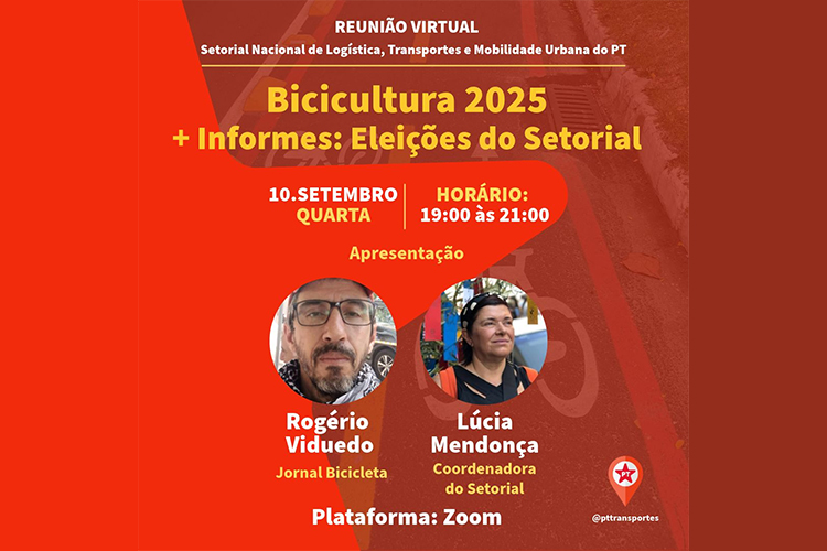 Na próxima quarta-feira, dia 10 de setembro de 2025, o Setorial Nacional de Logística, Transportes e Mobilidade Urbana do PT fará mais uma reunião virtual.