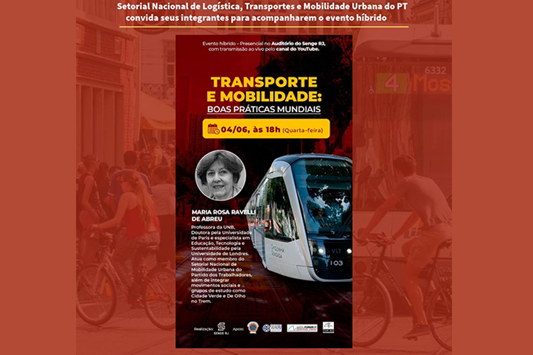 O Setorial de Logística, Transportes e Mobilidade Urbana do PT convida seus integrantes para acompanharem o evento híbrido Transporte e mobilidade: boas práticas mundiais, que acontecerá nesta quarta-feira (4), a partir das 18h, no Sindicato dos Engenheiros no Estado do Rio de Janeiro.
