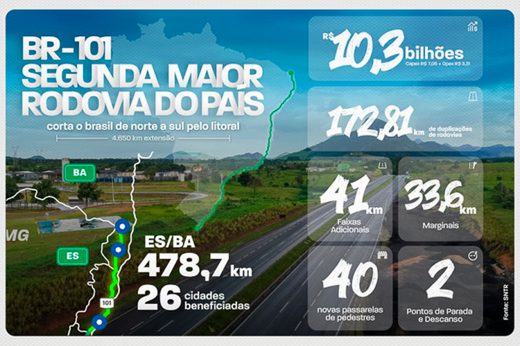 Um dos principais trechos logísticos do pais, a BR-101, com seus quase 500 quilômetros de rodovia, atende diretamente a 26 municípios, sendo 25 deles, entre Mucuri/BA e Mimoso/ES. Nesta esta nova etapa de concessão, a vigência do contrato é de 24 anos, já considerados os 14 anos cumpridos e mais uma década à frente, definida na repactuação.