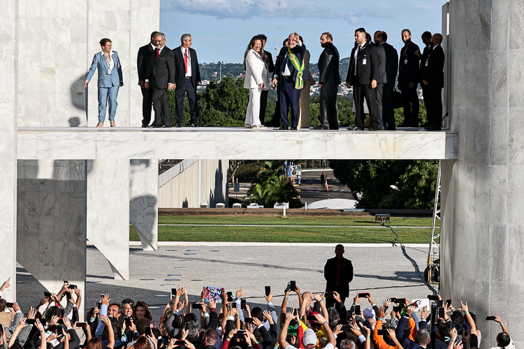 Do alto da rampa, Lula; Janja; o vice-presidente Geraldo Alckmin e a esposa, Lu Alckmin; Aline; Francisco; o líder indígena Raoni; Jucimara Santos, cozinheira do acampamento Lula Livre; Flávio Pereira, artesão que também atuou no acampamento; o metalúrgico Wesley Rocha; o professor Murilo Jesus; e Ivan Baron, jovem nordestino referência na luta anticapacitista, puderam ver a multidão à frente deles desfraldar uma imensa bandeira do Brasil, que também é de todos os brasileiros.